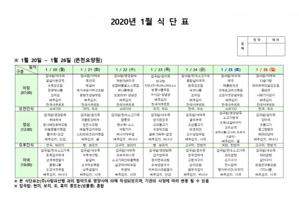 1월 셋째주 식단표 페이지 정보 작성자 은천노인복지회 작성일20-01-28 14:25 조회185,962회 댓글0건 관련링크 이전글 다음글 목록 답변 본문 1월 셋째주 식단표입니다. 이전글 다음글 목록 답변