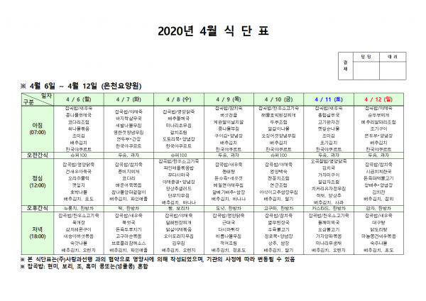 4월 첫째주 식단표 페이지 정보 작성자 은천노인복지회 작성일20-04-13 15:04 조회178,945회 댓글0건 관련링크 이전글 다음글 목록 답변 본문 . 이전글 다음글 목록 답변