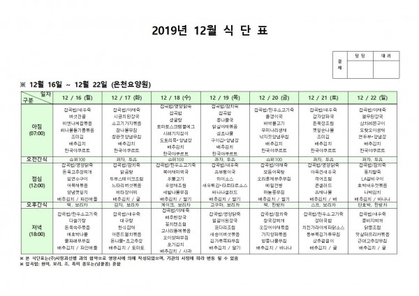 12월 셋째주 식단표 페이지 정보 작성자 은천노인복지회 작성일19-12-23 14:06 조회188,897회 댓글0건 관련링크 이전글 다음글 목록 답변 본문 12월 셋째주 식단표입니다. 이전글 다음글 목록 답변