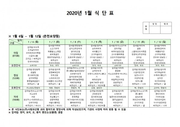 1월 첫째주 식단표 페이지 정보 작성자 은천노인복지회 작성일20-01-13 10:55 조회187,474회 댓글0건 관련링크 이전글 다음글 목록 답변 본문 1월 첫째주 식단표입니다. 이전글 다음글 목록 답변
