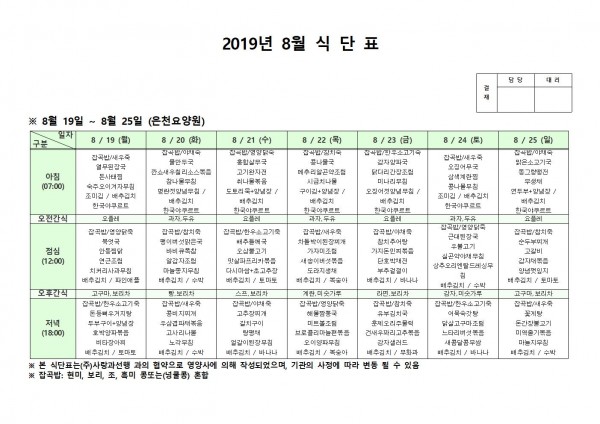 8월 넷째주 식단표 페이지 정보 작성자 은천노인복지회 작성일19-08-26 16:38 조회196,191회 댓글0건 관련링크 이전글 다음글 목록 답변 본문 8월 넷째주 식단표 이전글 다음글 목록 답변