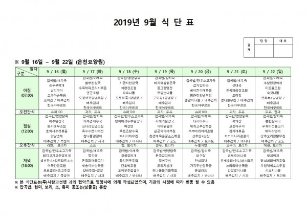9월 셋째주 식단표 페이지 정보 작성자 은천노인복지회 작성일19-09-23 13:27 조회196,506회 댓글0건 관련링크 이전글 다음글 목록 답변 본문 . 이전글 다음글 목록 답변