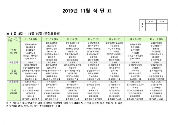 11월 첫째주 식단표 페이지 정보 작성자 은천노인복지회 작성일19-11-12 14:17 조회193,250회 댓글0건 관련링크 이전글 다음글 목록 답변 본문 11월 첫째주 식단표 이전글 다음글 목록 답변