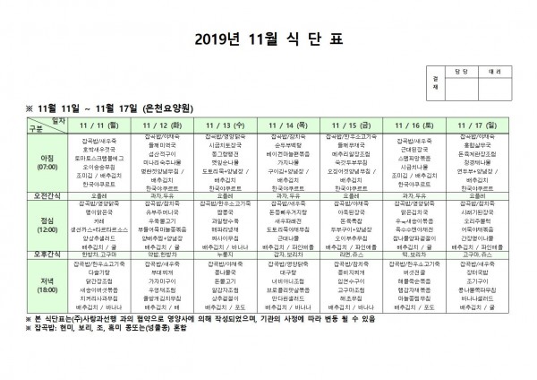 11월 둘째주 식단표 페이지 정보 작성자 은천노인복지회 작성일19-11-18 14:46 조회193,508회 댓글0건 관련링크 이전글 다음글 목록 답변 본문 11월 둘째주 식단표 이전글 다음글 목록 답변