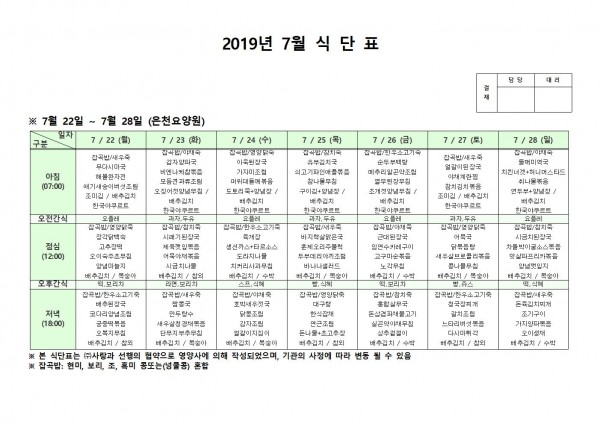 7월 넷째주 식단표 페이지 정보 작성자 은천노인복지회 작성일19-07-29 13:58 조회198,670회 댓글0건 관련링크 이전글 다음글 목록 답변 본문 7월 넷째주 식단표 이전글 다음글 목록 답변
