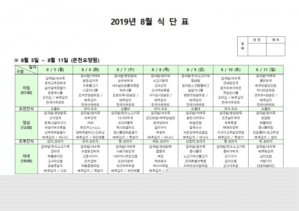 8월 둘째주 식단표 페이지 정보 작성자 은천노인복지회 작성일19-08-19 15:26 조회197,916회 댓글0건 관련링크 이전글 다음글 목록 답변 본문 8월 둘째주 식단표 이전글 다음글 목록 답변