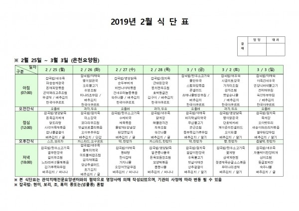 2월 넷째주 식단표 페이지 정보 작성자 은천노인복지회 작성일19-03-04 15:48 조회206,991회 댓글0건 관련링크 이전글 다음글 목록 답변 본문 2월 넷째주 식단표 이전글 다음글 목록 답변