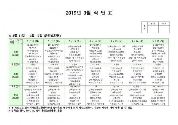 3월 둘째주 식단표 페이지 정보 작성자 은천노인복지회 작성일19-03-18 10:09 조회206,786회 댓글0건 관련링크 이전글 다음글 목록 답변 본문 3월 둘째주 식단표 이전글 다음글 목록 답변