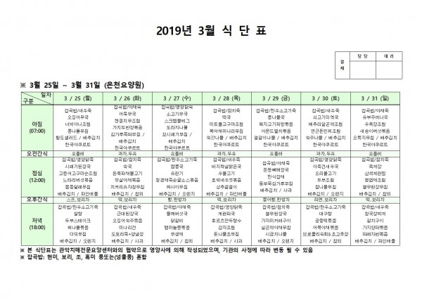3월 넷째주 식단표 페이지 정보 작성자 은천노인복지회 작성일19-04-01 11:06 조회205,856회 댓글0건 관련링크 이전글 다음글 목록 답변 본문 3월 넷째주 식단표 이전글 다음글 목록 답변