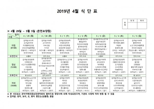 4월 다섯째주 식단표 페이지 정보 작성자 은천노인복지회 작성일19-05-07 14:13 조회205,754회 댓글0건 관련링크 이전글 다음글 목록 답변 본문 4월 다섯째주 식단표 이전글 다음글 목록 답변