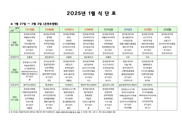 1월 다섯째주 식단표 페이지 정보 작성자 은천노인복지회 작성일25-01-24 10:07 조회16,987회 댓글0건 관련링크 이전글 다음글 목록 답변 본문 . 이전글 다음글 목록 답변