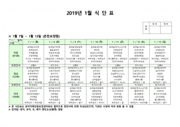 1월 첫째주 식단표 페이지 정보 작성자 은천노인복지회 작성일19-01-22 13:31 조회209,704회 댓글2건 관련링크 이전글 다음글 목록 답변 본문 1월 첫째주 식단표 이전글 다음글 목록 답변