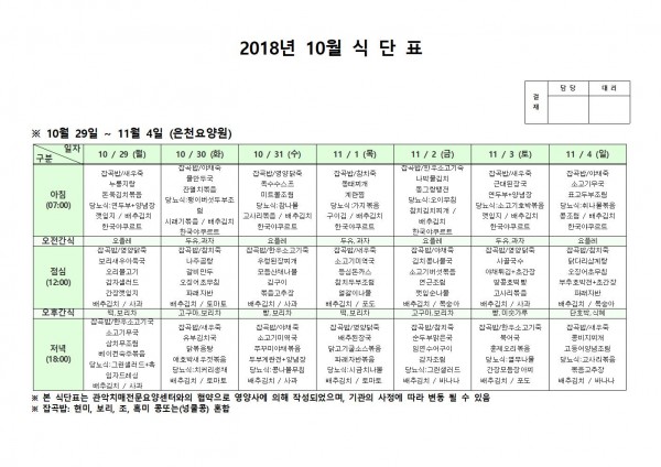 10월 5주째 식단표 페이지 정보 작성자 은천노인복지회 작성일18-12-07 09:36 조회208,122회 댓글0건 관련링크 이전글 다음글 목록 답변 본문 10월 5주째 식단표 이전글 다음글 목록 답변