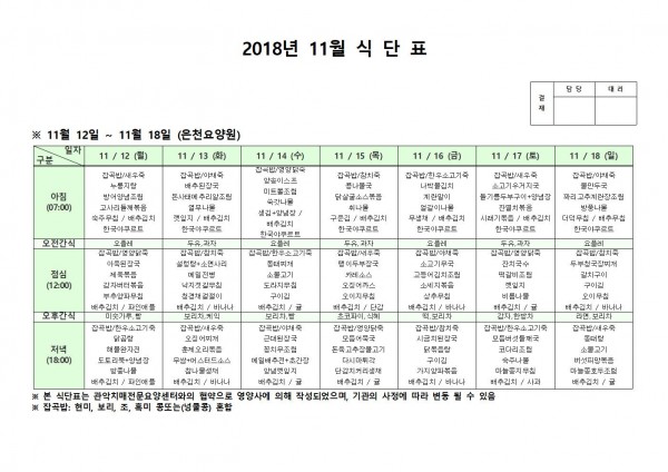 11월 2주째 식단표 페이지 정보 작성자 은천노인복지회 작성일18-12-07 09:37 조회208,635회 댓글0건 관련링크 이전글 다음글 목록 답변 본문 11월 2주째 식단표 이전글 다음글 목록 답변