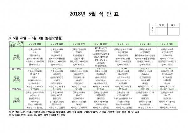5월 다섯째주 식단표 페이지 정보 작성자 은천노인복지회 작성일18-06-07 10:39 조회207,980회 댓글0건 관련링크 이전글 다음글 목록 답변 본문 5월 다섯쨰주 식단표 이전글 다음글 목록 답변