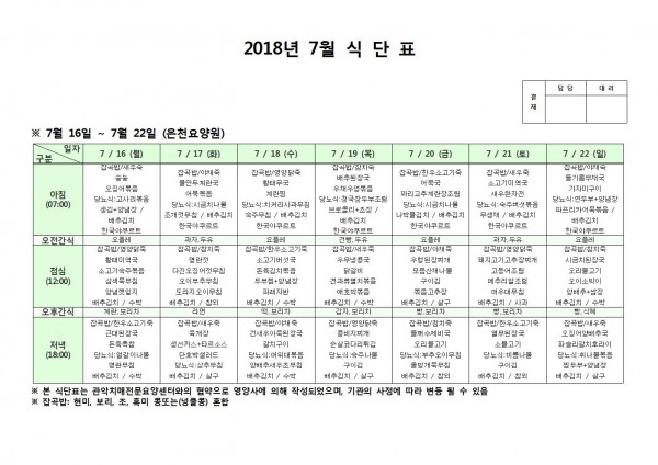 7월 셋째주 식단표 페이지 정보 작성자 은천노인복지회 작성일18-07-23 11:24 조회209,320회 댓글0건 관련링크 이전글 다음글 목록 답변 본문 7월 셋째주 식단표 이전글 다음글 목록 답변