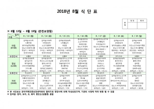 8월 셋째주 식단표 페이지 정보 작성자 은천노인복지회 작성일18-08-27 09:47 조회207,951회 댓글0건 관련링크 이전글 다음글 목록 답변 본문 8월 셋째주 식단표 이전글 다음글 목록 답변