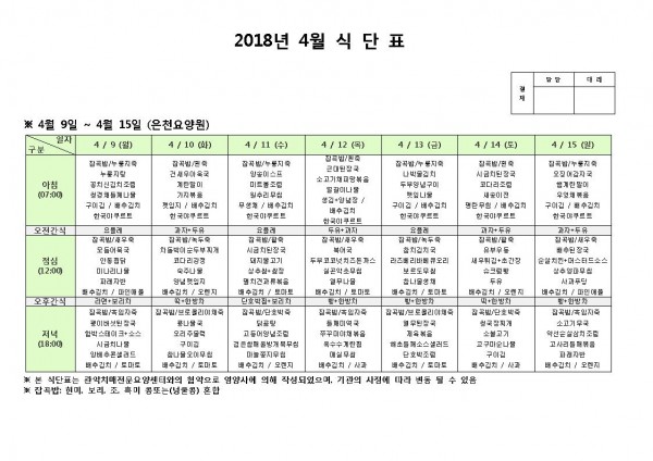 4월 둘째주 식단표 페이지 정보 작성자 은천노인복지회 작성일18-04-09 15:02 조회201,950회 댓글0건 관련링크 이전글 다음글 목록 답변 본문 4월 둘째주 식단표 이전글 다음글 목록 답변