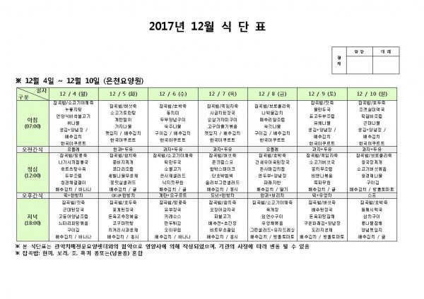 12월 둘째주 식단표 페이지 정보 작성자 은천노인복지회 작성일17-12-04 13:47 조회190,531회 댓글0건 관련링크 이전글 다음글 목록 답변 본문 12월 둘째주 식단표 이전글 다음글 목록 답변