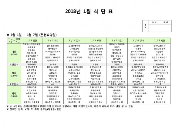 2018 1월 첫째주 식단표 페이지 정보 작성자 은천노인복지회 작성일18-01-03 11:34 조회194,295회 댓글0건 관련링크 이전글 다음글 목록 답변 본문 2018 1월 첫째주 식단표 이전글 다음글 목록 답변