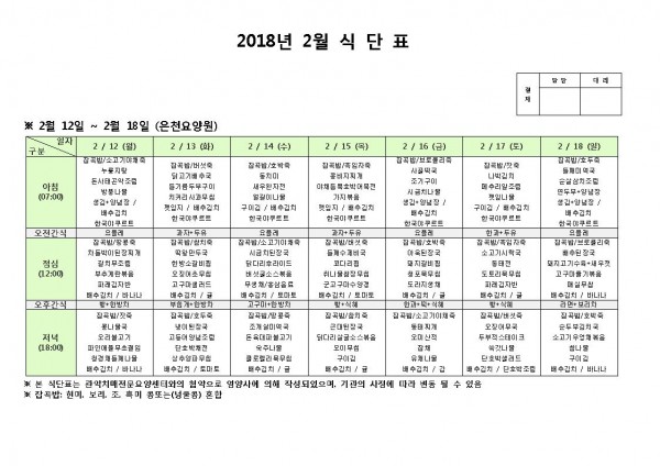 2월 둘째주 식단표 페이지 정보 작성자 은천노인복지회 작성일18-02-12 11:15 조회196,587회 댓글0건 관련링크 이전글 다음글 목록 답변 본문 2월 둘째주 식단표 이전글 다음글 목록 답변