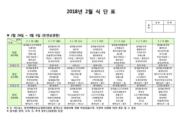 3월 첫째주 식단표 페이지 정보 작성자 은천노인복지회 작성일18-02-27 16:10 조회197,544회 댓글0건 관련링크 이전글 다음글 목록 답변 본문 3월 첫째주 식단표 이전글 다음글 목록 답변