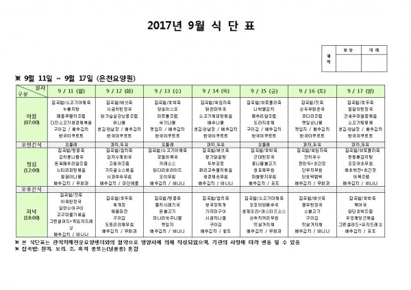 9월 둘째주 식단표 페이지 정보 작성자 은천노인복지회 작성일17-09-11 17:01 조회183,756회 댓글0건 관련링크 이전글 다음글 목록 답변 본문 9월 둘째주 식단표 이전글 다음글 목록 답변