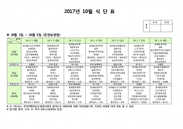 10월 첫째주 식단표 페이지 정보 작성자 은천노인복지회 작성일17-10-11 10:52 조회184,963회 댓글0건 관련링크 이전글 다음글 목록 답변 본문 10월 첫째주 식단표 이전글 다음글 목록 답변