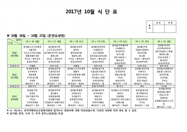 10월 셋째주 식단표 페이지 정보 작성자 은천노인복지회 작성일17-10-17 17:39 조회186,045회 댓글0건 관련링크 이전글 다음글 목록 답변 본문 10월 셋째주 식단표 이전글 다음글 목록 답변