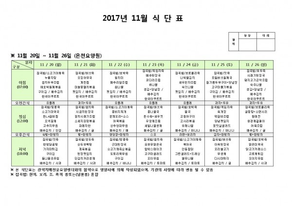 11월 넷째주 식단표 페이지 정보 작성자 은천노인복지회 작성일17-11-20 11:22 조회189,045회 댓글0건 관련링크 이전글 다음글 목록 답변 본문 11월 넷째주 식단표 이전글 다음글 목록 답변