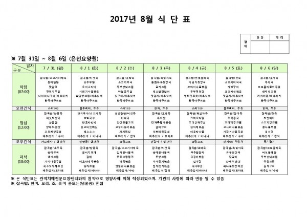 8월 첫째주 식단표 페이지 정보 작성자 은천노인복지회 작성일17-08-01 13:43 조회182,872회 댓글0건 관련링크 이전글 다음글 목록 답변 본문 8월 첫째주 식단표 이전글 다음글 목록 답변
