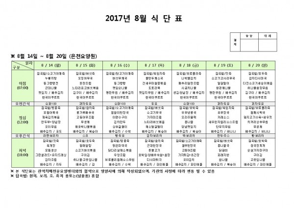 8월 셋째주 식단표 페이지 정보 작성자 은천노인복지회 작성일17-08-14 14:05 조회182,288회 댓글0건 관련링크 이전글 다음글 목록 답변 본문 8월 셋째주 식단표 이전글 다음글 목록 답변