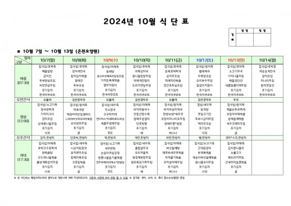 10월 둘째주 식단표 페이지 정보 작성자 은천노인복지회 작성일24-10-04 11:48 조회22,649회 댓글0건 관련링크 이전글 다음글 목록 답변 본문 . 이전글 다음글 목록 답변
