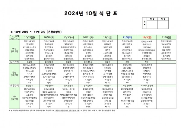 10월 다섯째 주 식단표 페이지 정보 작성자 은천노인복지회 작성일24-10-24 15:18 조회21,907회 댓글0건 관련링크 이전글 다음글 목록 답변 본문 . 이전글 다음글 목록 답변
