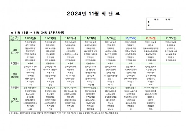 11월 셋째주 식단표 페이지 정보 작성자 은천노인복지회 작성일24-11-15 09:26 조회21,648회 댓글0건 관련링크 이전글 다음글 목록 답변 본문 . 이전글 다음글 목록 답변