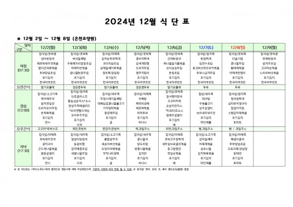 12월 첫째주 식단표 페이지 정보 작성자 은천노인복지회 작성일24-11-29 16:53 조회21,066회 댓글0건 관련링크 이전글 다음글 목록 답변 본문 . 이전글 다음글 목록 답변