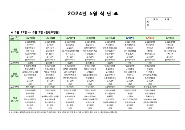 5월 다섯째주 식단표 페이지 정보 작성자 은천노인복지회 작성일24-05-24 16:18 조회28,014회 댓글0건 관련링크 이전글 다음글 목록 답변 본문 . 이전글 다음글 목록 답변