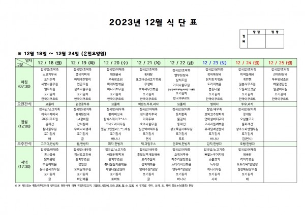 12월 넷째주 식단표 페이지 정보 작성자 은천노인복지회 작성일23-12-15 11:21 조회37,000회 댓글0건 관련링크 이전글 다음글 목록 답변 본문 . 이전글 다음글 목록 답변