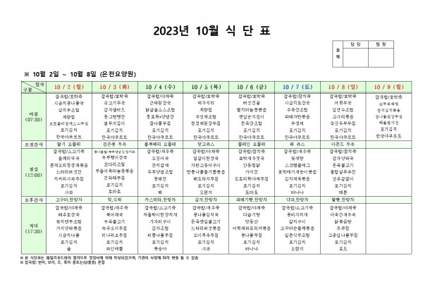 10월 첫째주 식단표 페이지 정보 작성자 은천노인복지회 작성일23-10-05 17:41 조회40,511회 댓글0건 관련링크 이전글 다음글 목록 답변 본문 . 이전글 다음글 목록 답변