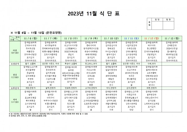 11월 둘째주 식단표 페이지 정보 작성자 은천노인복지회 작성일23-11-02 17:19 조회39,184회 댓글0건 관련링크 이전글 다음글 목록 답변 본문 . 이전글 다음글 목록 답변