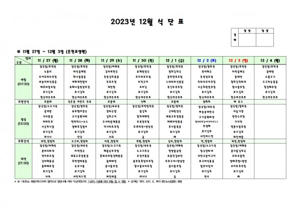 12월 첫째주 식단표 페이지 정보 작성자 은천노인복지회 작성일23-11-24 09:37 조회37,287회 댓글0건 관련링크 이전글 다음글 목록 답변 본문 . 이전글 다음글 목록 답변