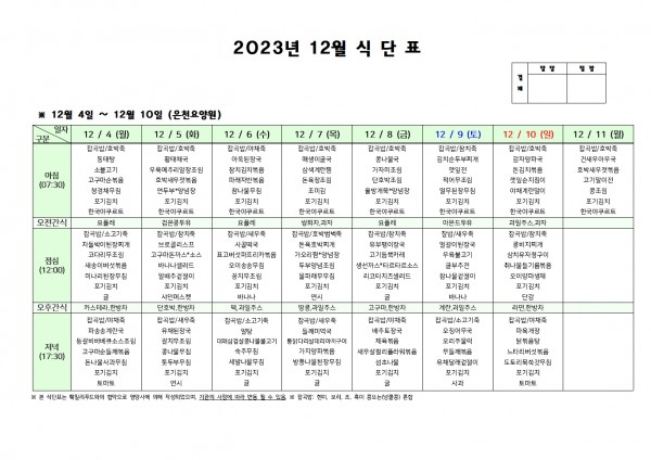 12월 둘째주 식단표 페이지 정보 작성자 은천노인복지회 작성일23-12-01 16:35 조회35,027회 댓글0건 관련링크 이전글 다음글 목록 답변 본문 . 이전글 다음글 목록 답변