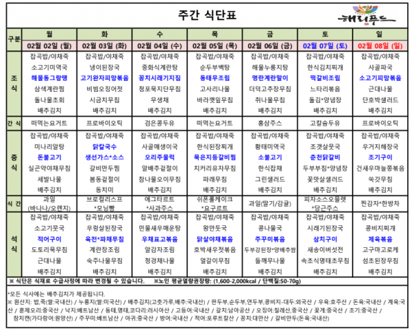 2월 첫째주 식단표 페이지 정보 작성자 은천노인복지회 작성일26-02-04 11:48 조회4,468회 댓글0건 관련링크 이전글 다음글 목록 답변 본문 2월 첫째주 어르신 식단표 안내해 드립니다. 정성과 영양을 담아 준비하겠습니다. 이전글 다음글 목록 답변