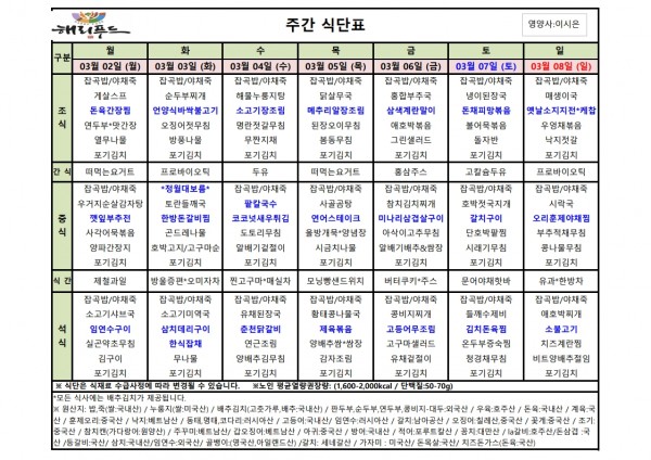 3월 첫째주 식단표 페이지 정보 작성자 은천노인복지회 작성일26-02-27 13:13 조회2,612회 댓글0건 관련링크 이전글 다음글 목록 답변 본문 2월 넷째주 어르신 식단표 안내해 드립니다. 정성과 영양을 담아 준비하겠습니다. 이전글 다음글 목록 답변