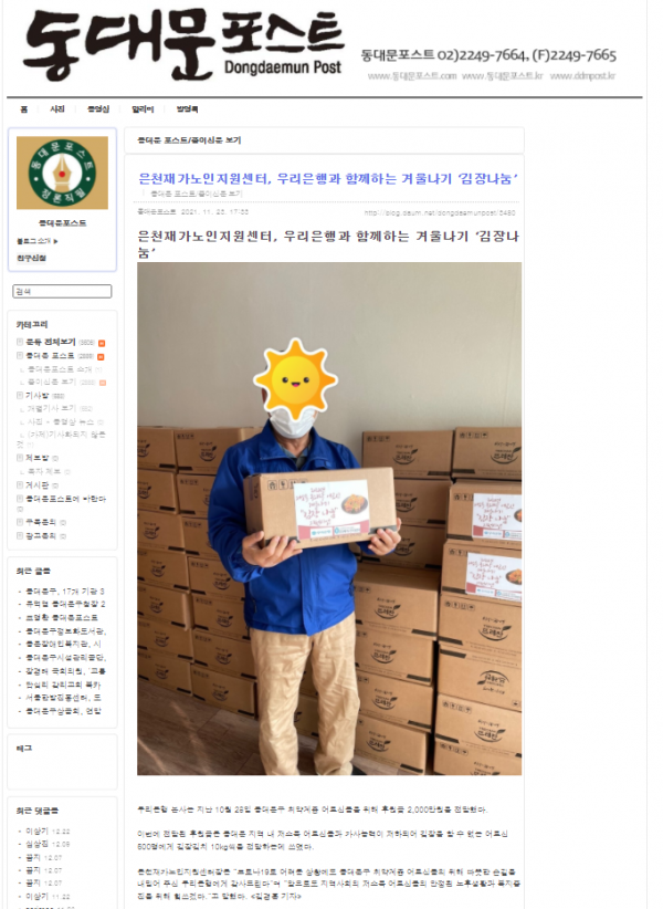 동대문포스트 김장기사 페이지 정보 작성자 은천노인복지회 작성일21-12-29 17:25 조회9,347회 댓글0건 관련링크 https://blog.daum.net/dongdaemunpost/3480 5544회 연결 목록 답변 본문 동대문포스트에 김장나눔 행사 기사입니다~ 목록 답변