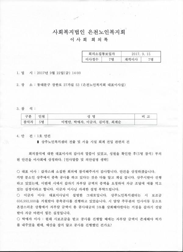 이사회의록 공개 페이지 정보 작성자 은천노인복지회 작성일17-10-16 14:27 조회36,992회 댓글0건 관련링크 목록 본문 9월 22일 상주노인복지센터 전출의 건 이사회의록을 공개합니다. 목록