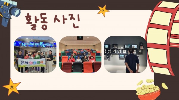 [서울시동대문구재가노인복지기관] 5월 문화체험활동 '영화관람' 페이지 정보 작성자 은천노인복지회 작성일25-06-11 14:39 조회3,641회 댓글0건 관련링크 이전글 다음글 목록 답변 본문 촬영소 사거리에 위치한 '답십리영화미디어아트센터'에서 영화 관람을 진행하였습니다! 이전글 다음글 목록 답변