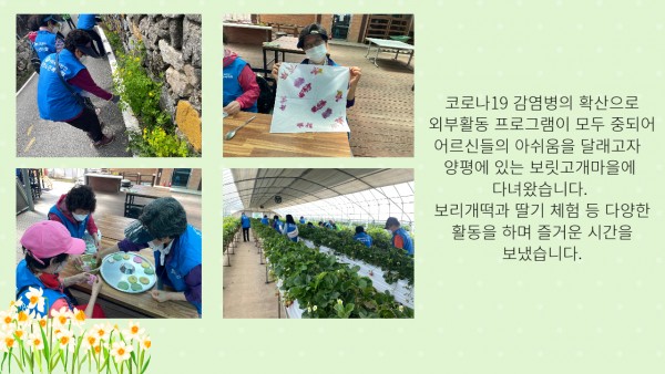 [재가노인지원] 봄 나들이 페이지 정보 작성자 은천노인복지회 작성일22-06-03 17:15 조회18,877회 댓글0건 관련링크 이전글 다음글 목록 답변 본문 재가노인지원센터 어르신들과 양평 보릿고개마을로 나들이를 다녀왔습니다. 이전글 다음글 목록 답변